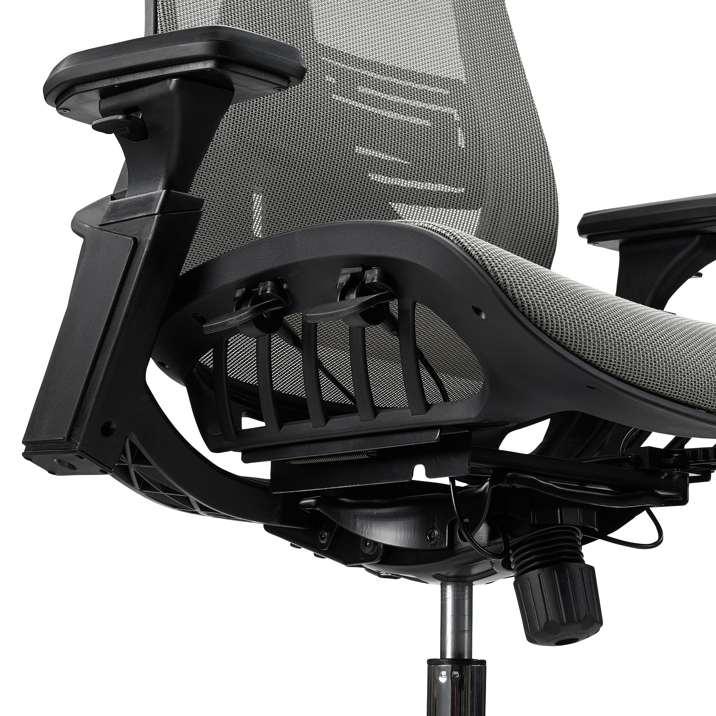 De rugleuning is volledig ergonomisch gevormd en bevat een geïntegreerde lendensteun. Op de foto's kunt u de curve goed waarnemen, ontworpen om zich als een handschoen volledig op de rug aan te sluiten. Het ademende mesh materiaal valt op omdat het een resistent, duurzaam en gemakkelijk schoon te maken materiaal is.