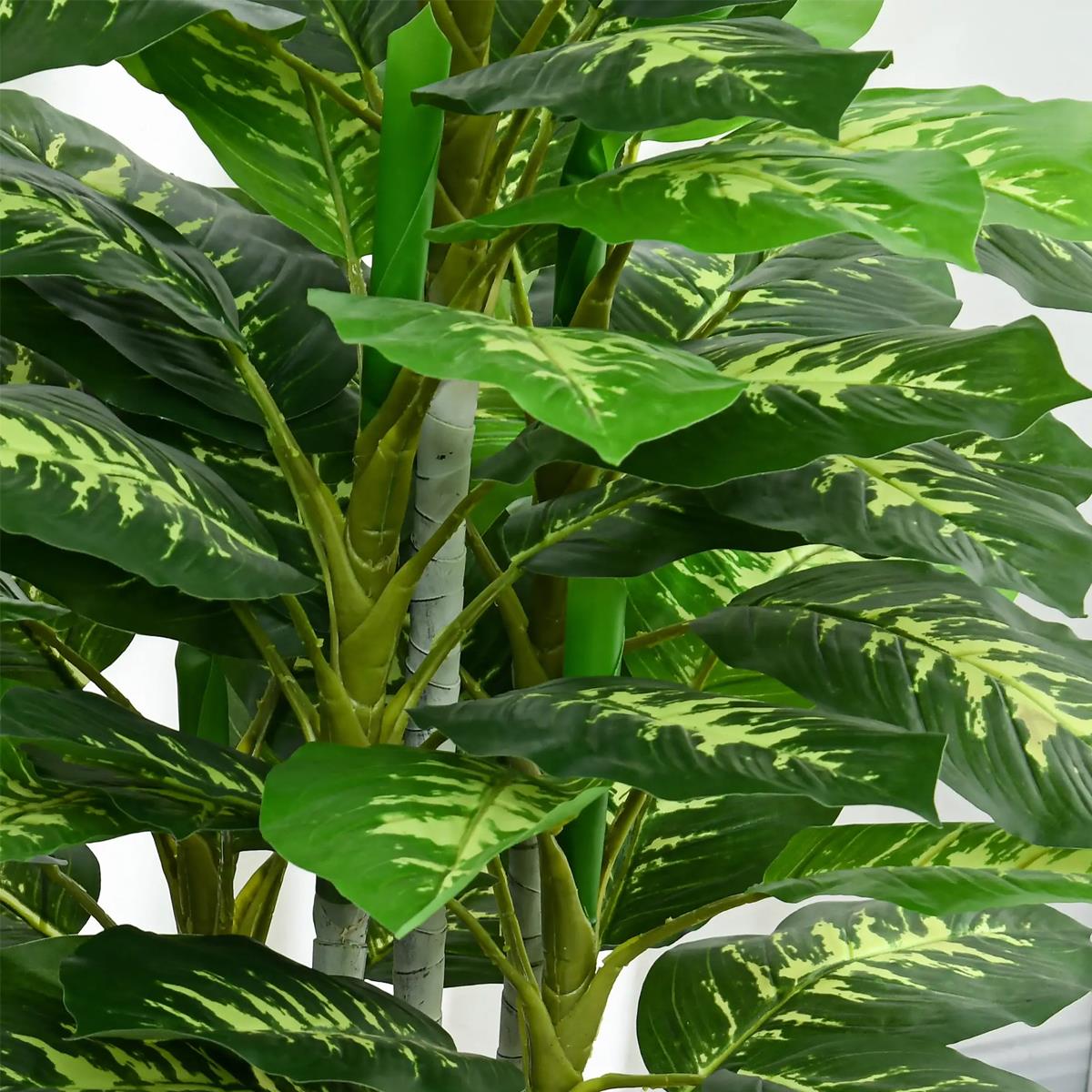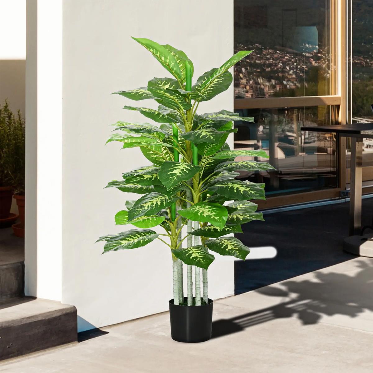 Met een hoogte van 120 cm valt de plant op door zijn compacte en weelderige structuur, ideaal om aanwezigheid te creëren zonder al te veel ruimte in te nemen. De vijf stengels en 53 bladeren in verschillende groene tinten, met delicate lichte nerven die de afwerking van natuurlijke tropische planten nabootsen, zorgen voor een zeer realistisch en decoratief visueel effect.