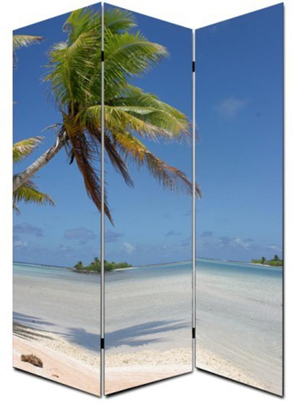 Dit decoratieve scherm met 3 panelen valt op door zijn ontwerp, dat u doet denken aan een strand van Bora Bora, omringd door palmbomen en kristalhelder water. Bovendien heeft het verschillende ontwerpen op elk van zijn kanten.